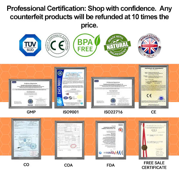 certifications.TÜV SÜD, CE, BPA Free, Natural Ingredients, and “Made in the UK” badges? They’re not just logos—they’re proof we meet strict global safety and quality standards. Plus, certifications like GMP, ISO9001, ISO22716, CE, CO, COA, FDA, and Free Sale Certificate? They’re our promise that every strip is crafted to work, safely.And here’s the kicker: Spot a counterfeit? We’ll refund you 10x the price. Because your trust matters—shop with total confidence, knowing you’re getting the real, certified deal for a dazzling, worry - free smile.Certifications validate quality, safety, and authenticity—so you can brighten your smile without a second thought.