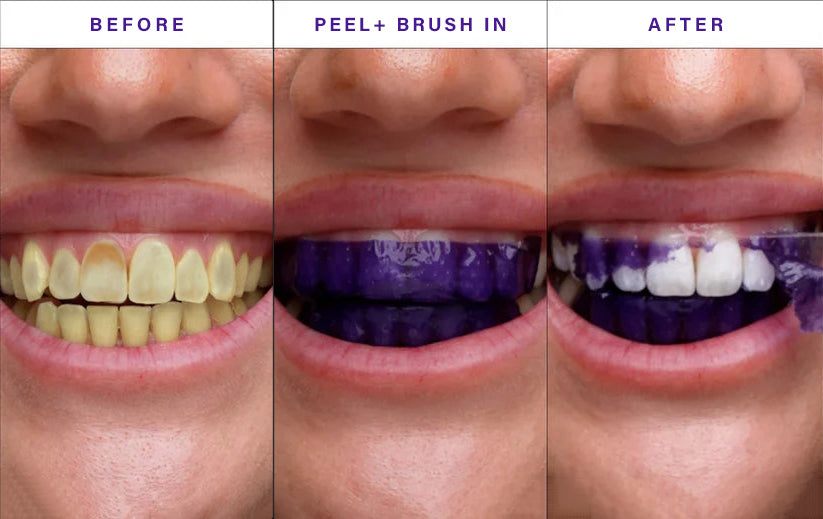 After 30 minutes, peel off the strips gently (start from the edges). Brush your teeth to remove any purple residue—hello, fresher, whiter teeth!
