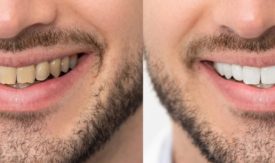 • Teeth look naturally brighter and more balanced, with yellow undertones visibly canceled out.