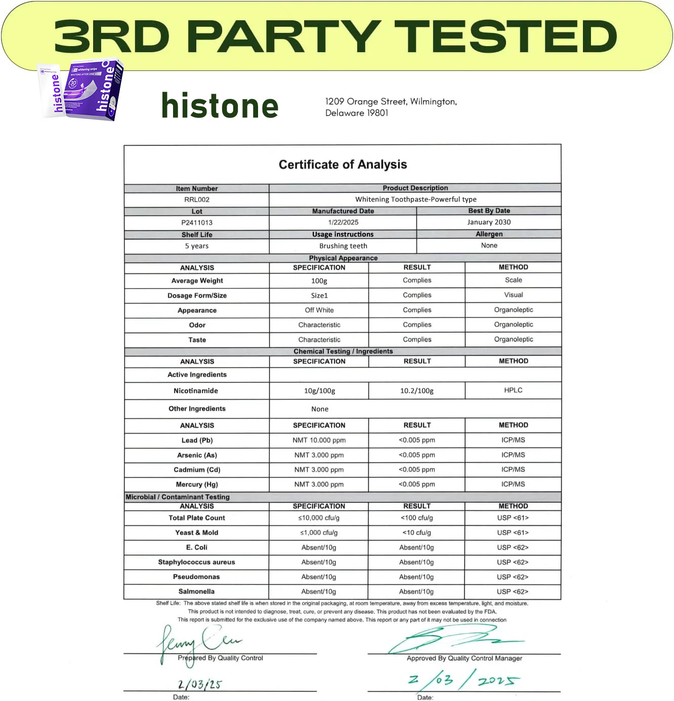 Histone V36 Whitening Strips have undergone rigorous third - party testing, and the results are in – they meet the highest standards of qality.